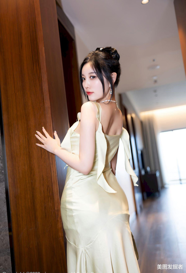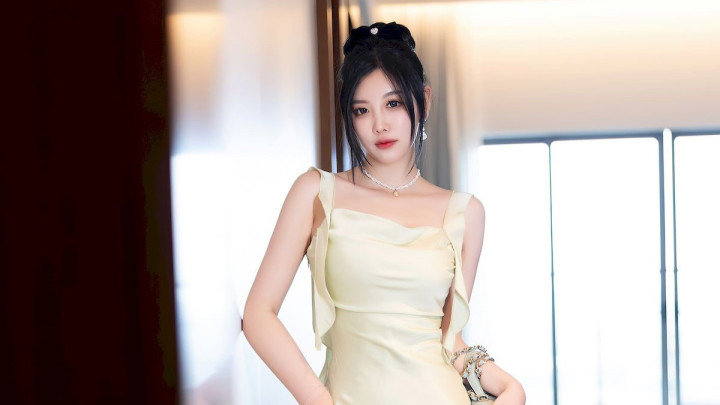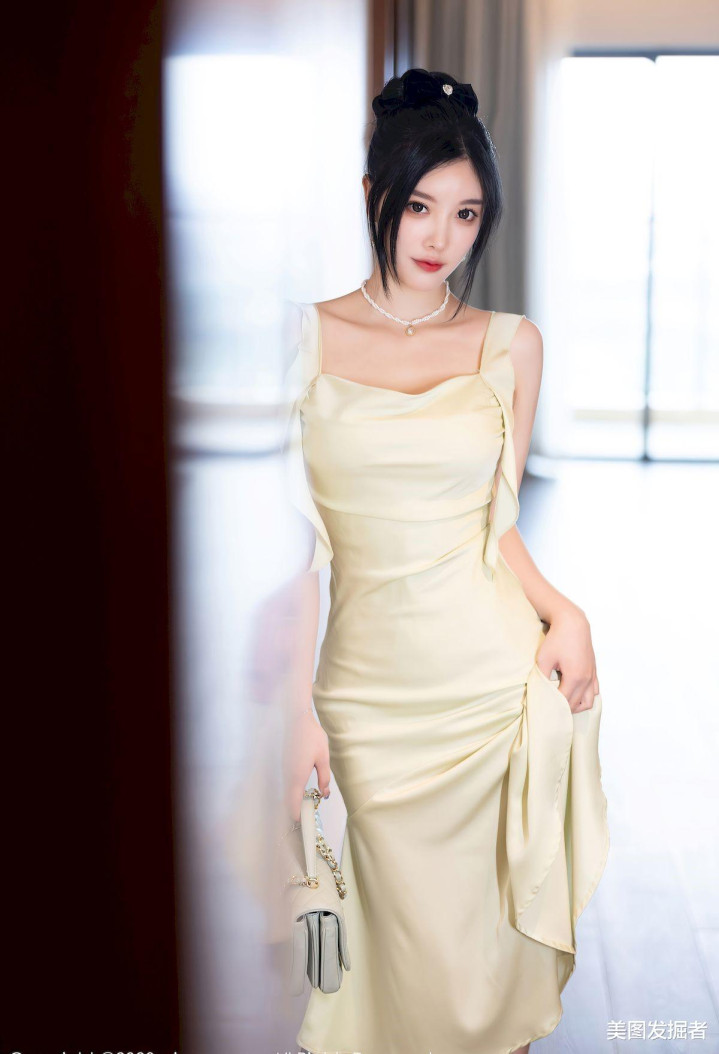 淡黄吊带裙勾勒曲线,荷叶边肩饰轻盈灵动。乌发盘髻显优雅,金饰点缀映锁骨。高跟鞋拉长腿型,手包简约增时尚。一颦一动,皆是自信绽放。