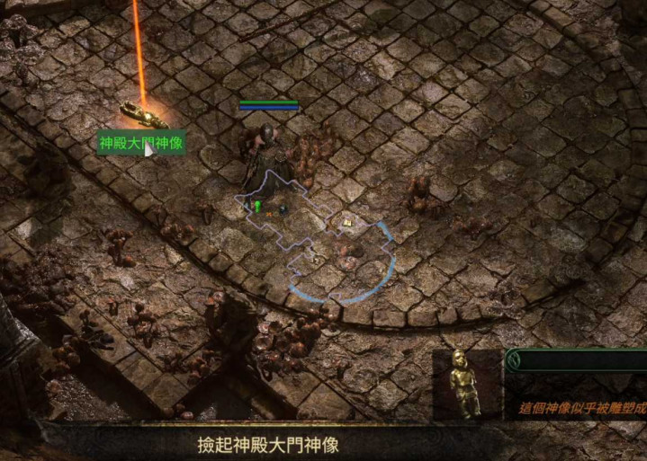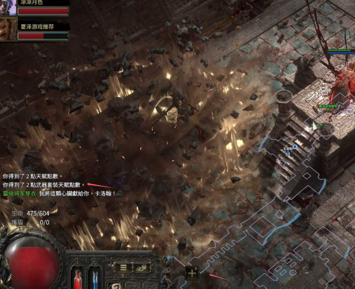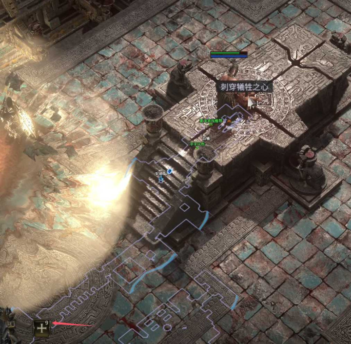 在这里我们要做两件事,第一件就是在击杀小怪的途中寻找是牺牲之心。第二件事就是击败邪魔毒蛇纳普阿兹。这里要注意一下。牺牲之心并不只在奥扎尔会掉落。在下一张地图阿戈拉也会掉落的。当我们在取得牺牲之心之后需要在阿哥拉找到一个祭坛,然后捡起匕首刺穿心之心。这个祭坛的位置一定是在右边的。所以在找祭坛的时候,沿着右边的路走就可以了。当刺穿之后,我们会直接获得2点天赋点。