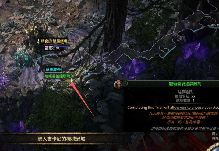 接下来我们就需要去到龙蜥湿地。这里我们需要击杀龙蜥。他击杀之后会掉落龙溪最后通牒雕刻也就是我们第二个升华所需要的任务道具,到这里我们就可以开启第二升华了。然后我们需要进入吉卡尼的机械迷城。入口就在击杀龙蜥位置的左边。