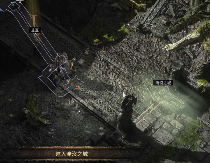 回城之后沿着这个楼梯一直往下走。到这里和艾瓦对话之后,他会给我们打开。淹没之城的入口,然后我们需要在淹没之城里找到熔岩宝库和污垢顶峰的入口。