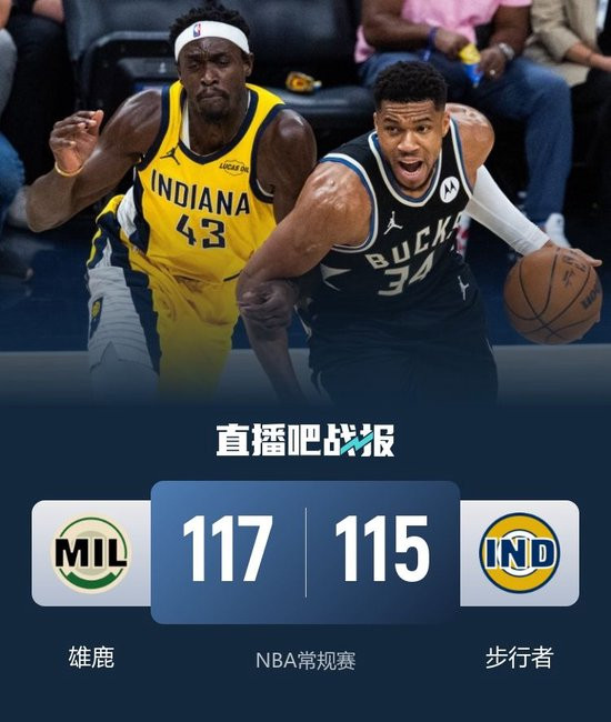 比赛开场,双方先是交替得分,随后雄鹿外线开张,连续命中建立两位数领先优势。次节一上来步行者打出一波10-2缩小分差,随后双方陷入拉锯战,字母哥在篮下予取予求,步行者则是全员发力,雄鹿56-53进入下半场。易边再战,步行者连续进攻内线反超比分,但随后雄鹿在罗林斯串联下展开攻势,雄鹿84-77领先7分进入第四节。末节雄鹿外线手感再次打开,又是将差距扩大到10分以上,但步行者非常顽强,在西亚卡姆带领下连续杀伤禁区取分,在最后三分钟将比分打平,双方进入决战时刻,先是各自命中三分,随后西亚卡姆和AJ-格林都是两罚一中,内史密斯在还剩14秒时突破上进再次打平,最后字母哥中投压哨绝杀,雄鹿117-115险胜。