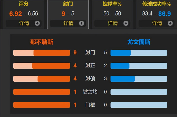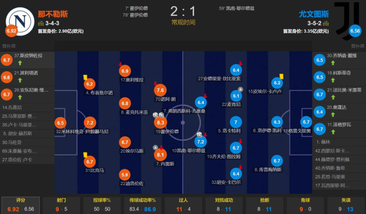 此役踢得场面较为沉闷,控球率五五开,但射门次数都不多,其中那不勒斯是9次射门4次射正;而尤文图斯是5次射门2次射正。其中霍伊伦3次射门就取得3次射正打入了2球,还有一次关键传球。那不勒斯伤兵满营,德布劳内等人均缺席,曼联弃将霍伊伦撑起这场意甲强强对话的攻城锤角色,梅开二度把球赢,助那不勒斯先赛登顶意甲积分榜。