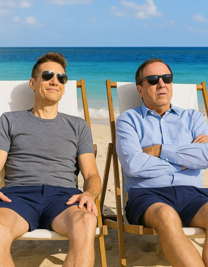 随后GSW Ball Report还晒出勇士总经理小邓利维和老板拉科布一起度假的合成图,并写道: