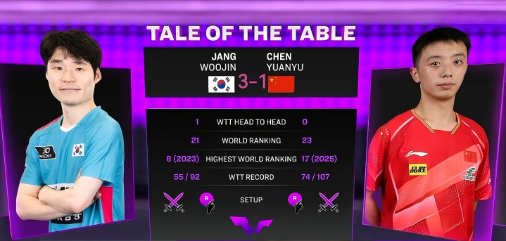 张禹珍比陈垣宇强在心理素质和反手位的稳定性,本场比赛陈垣宇一度在比赛中打出优势时段,但是高光续航能力不足,尤其是反手位,极其拉胯,最终比较遗憾的输掉比赛,本赛季第四次上演一轮游。