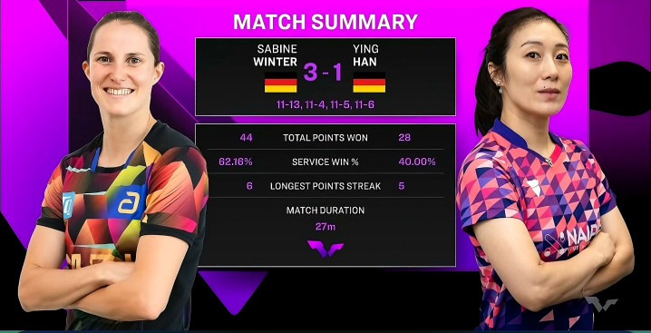 这是本站女线第一场德比,萨宾·温特非常熟悉老大姐韩莹的打法,但是韩莹却对今年技改的温特不甚了解。这场比赛,温特的防弧胶皮完整压制了韩莹的颗粒削球,韩莹输的毫无脾气。