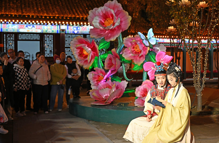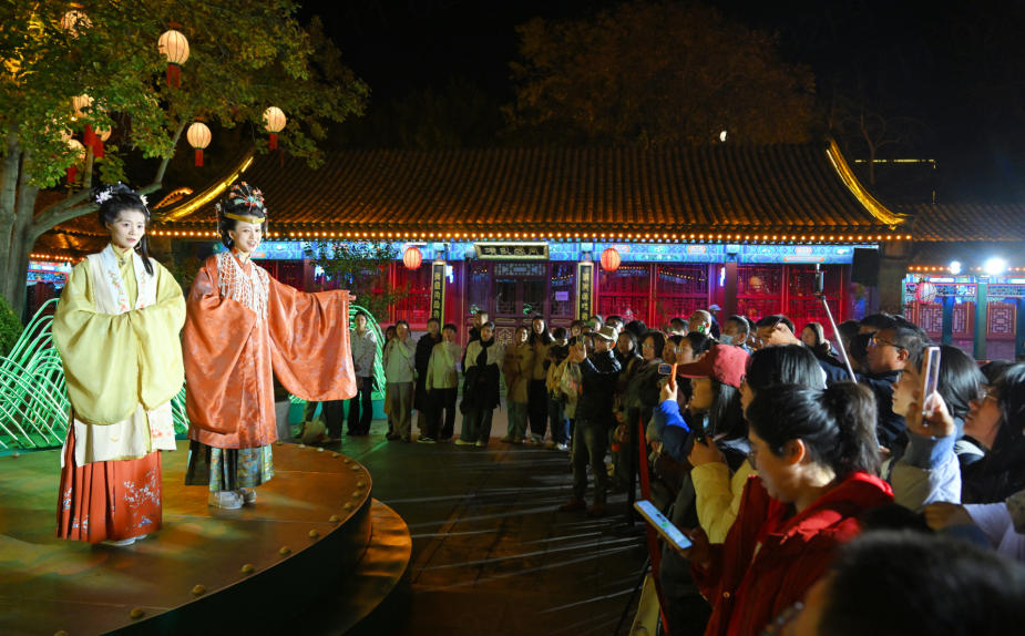 11月9日,游客在正定县荣国府景区观看“一梦入红楼”沉浸式夜游演出。