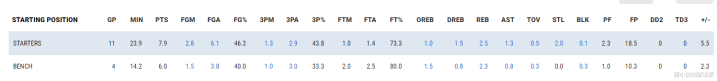 奥科吉本赛季先发11场比赛,场均23.9分钟,拿到7.9分2.5篮板1.3助攻2抢断0.1盖帽,命中率46.3%,三分命中率43.8%,场均命中1.3个三分球,正负值+5.5,也就是11场比赛正负值高达+61。