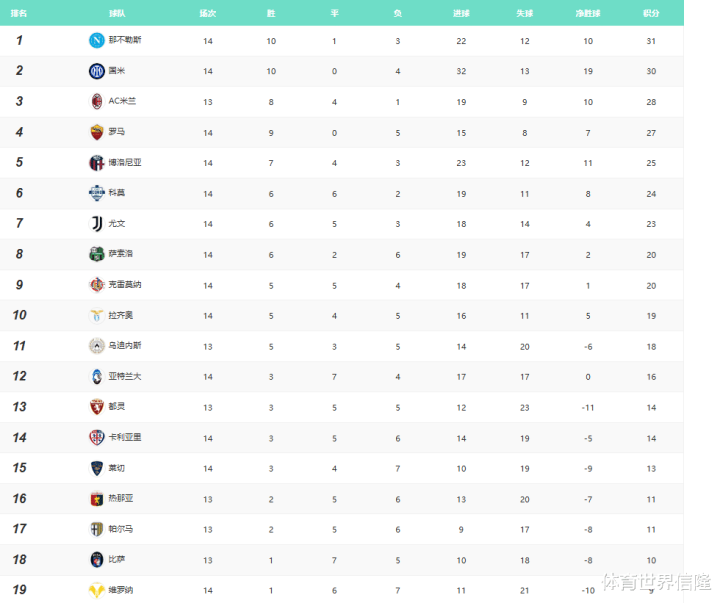 那不勒斯积31分排名第一,国米落后1分紧随其后,AC米兰少赛一场28分第三,罗马27分第四;博洛尼亚、科莫和尤文图斯分列第五到第七位,他们跟前四的球队差距也不大。