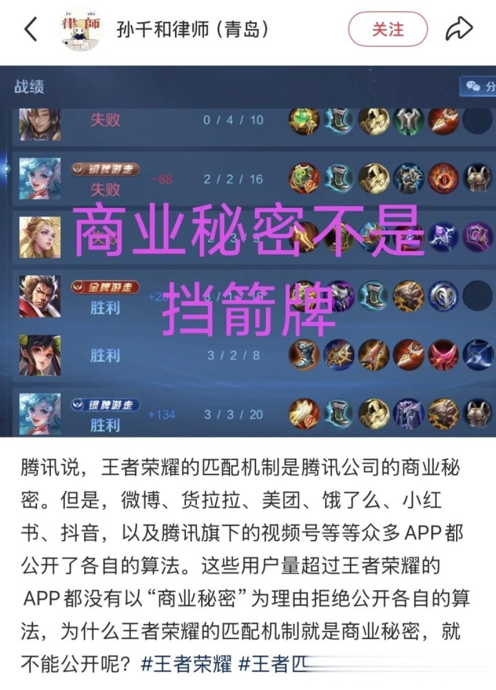 因为一名律师,应该知道消费者保护法里的知情权不包括算法,也就是说这场官司从根本上缺乏法律依据支持。而且想要证明王者荣耀的匹配机制不公平,很难找到切实的证据,这点孙律师自己也不否认,对媒体直言找证据很难。换句话说,在没有请求权基础且缺乏证据的情况下,她还是选择打一场没有胜算的诉讼。