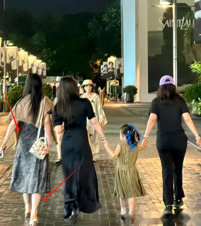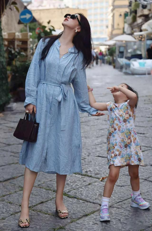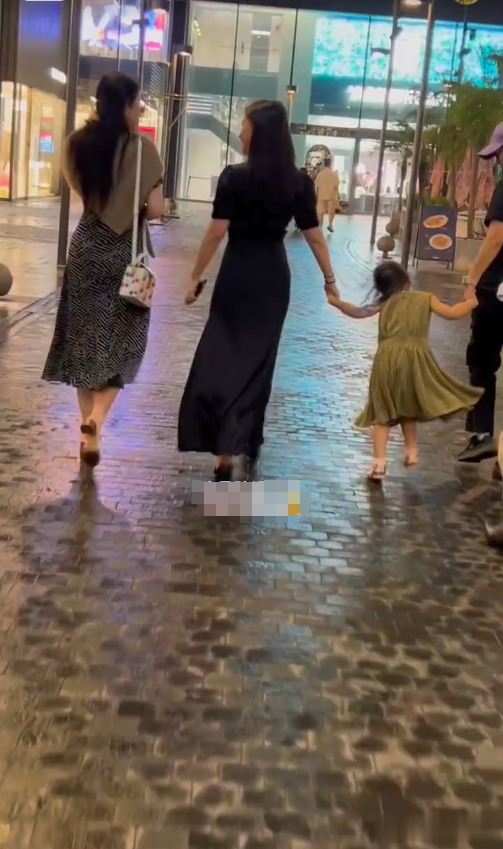 她一手拉着女儿,一边看向前方的丈夫,和他说着什么,一家人非常的和谐甜蜜。