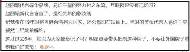 因为她合作的该大牌在6年前曾因辱华事件,遭遇全网抵制,当时的代言人易烊千玺宣布解约。