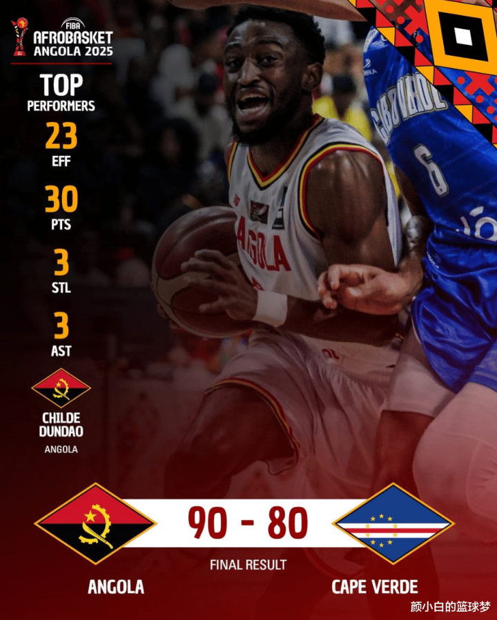安哥拉男篮90-80击败佛得角男篮,这两队的硬实力差距还是较大,安哥拉首节领先9分,第二节与第三节佛得角艰难的缩小了7分的差距,可末节又被安哥拉一波流带走。安哥拉核心邓达奥全场比赛33分钟,13中5,罚球23中18拿到30分3助攻。