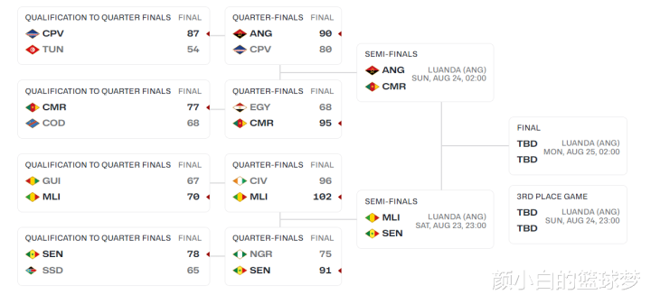 北京时间8月22日,男篮非洲杯1/4决赛最后一场完结,安哥拉男篮90-80大胜佛得角男篮拿到最后一张四强门票。四强就此出炉:安哥拉、喀麦隆、马里、塞内加尔,半决赛对阵——安哥拉VS喀麦隆、马里VS塞内加尔。