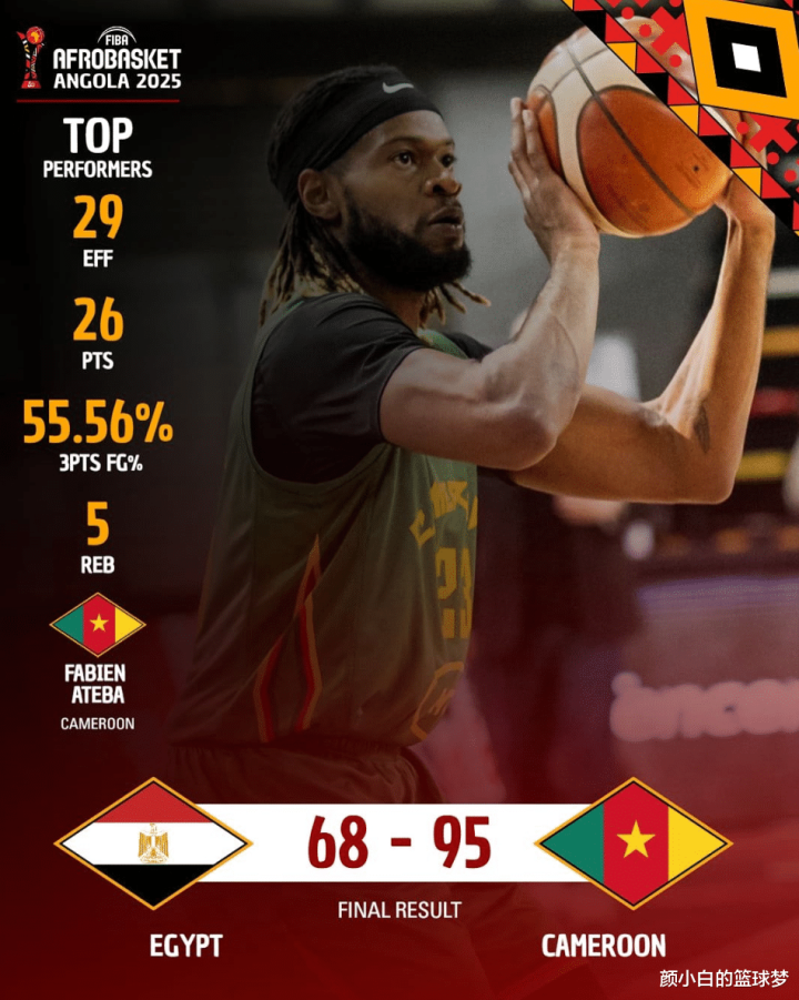 喀麦隆男篮95-68大胜埃及,这两支球队的硬实力明显不在一个层次上面,喀麦隆男篮全队4人上双+两人20+,阿特巴10中6+三分9中5拿到26分5篮板,希尔13中8拿到20分6篮板,鹈鹕中锋伊夫-米西7中4拿到10分7篮板3助攻,比迪亚斯拿到12分。