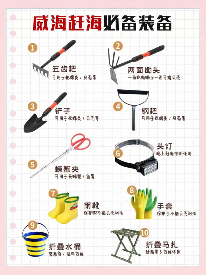 赶海装备别瞎买!这几样就够了:五齿耙用来搂贝壳超省力,螃蟹夹必备(别用手抓!小螃蟹夹人超疼),雨靴和手套保护自己,折叠水桶装海货,晚上去的话再带个头灯,轻便又好用!