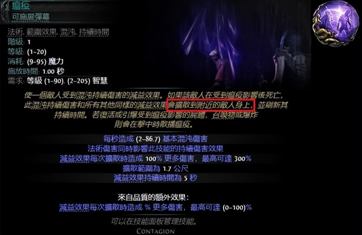 这个技能打到敌人身上有高额的混沌持续伤害,并且能被瘟疫传播,也就是说我们击中被瘟疫标记的小怪后,满额伤害会同步传播至其他小怪身上。而且瘟疫是优先附加在鼠标范围内血量最低的怪物身上的,我们用靈魂吸取击中后,马上接瘟疫就能确保把这一发靈魂吸取的伤害传播出去。