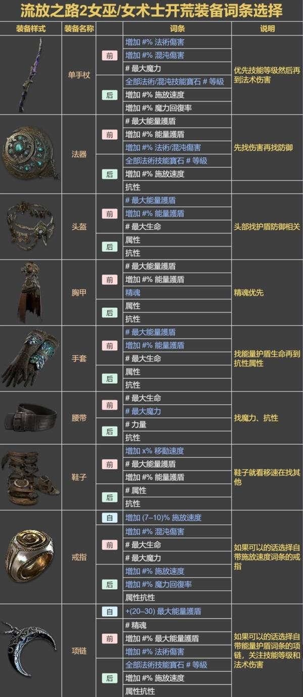 首先我们为了提高输出伤害,就得找技能等级词条,法术技能等级包含混沌技能等级,法术技能伤害包含混沌技能伤害,所以法术或者混沌相关的词条都对我们有用,要记住,技能标签为法术的不吃攻击速度加成,只吃施放速度加成,这一点一定要区分清楚。接着再关注一下蓝量需求找回蓝词条。然后再到能量护盾、精魂、属性和抗性。