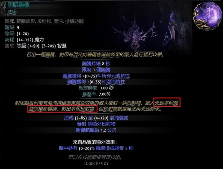 我们31级9级技能可以学习絕望,该诅咒技能减敌方混沌抗性完美契合。在使用腐朽咒術辅助技能后,絕望诅咒能给敌方单位挂上一层混沌持续伤害效果,加上瘟疫和靈魂吸取技能此时有3层效果,黑暗雕像就能一秒3发,而我们给黑暗雕像上个過剩辅助技能就可以召唤2个雕像,那么就一秒6发。