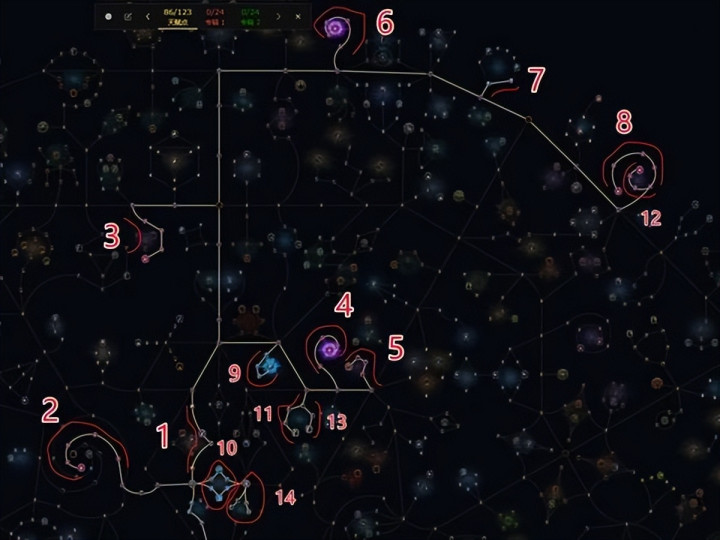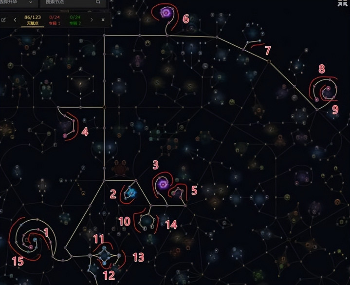 由于我们没使用什么赶路技能,混沌流清图又非常轻松,所以不需要在哪里停下来补等级,一般都是跟着地图等级走的,所以直接放全天赋图跟着点即可。由于女术士和女巫在天赋上有一些不同,所以放出两个版本: