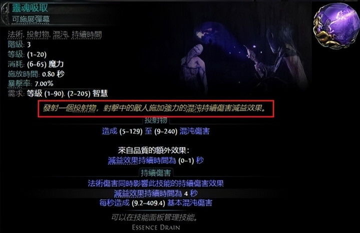 但是瘟疫伤害是很低的,它的最大作用就是能扩散。技能描述里提到“和所有其他同樣的減益效果會擴散到附近的敵人身上”,利用这一点,我们找到了靈魂吸取这个技能。