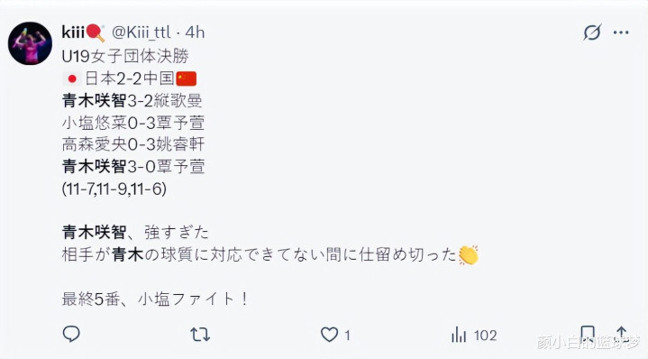 2025年国际乒联世青赛,U19女团决赛,中国队3-2逆转日本队夺冠,这场比赛纵歌曼决胜盘0-2落后3-2逆转小盐悠菜成为国乒的超级功臣,日乒这边小盐悠菜、高森爱央都没有取分,18岁的青木咲智一人独取两分。